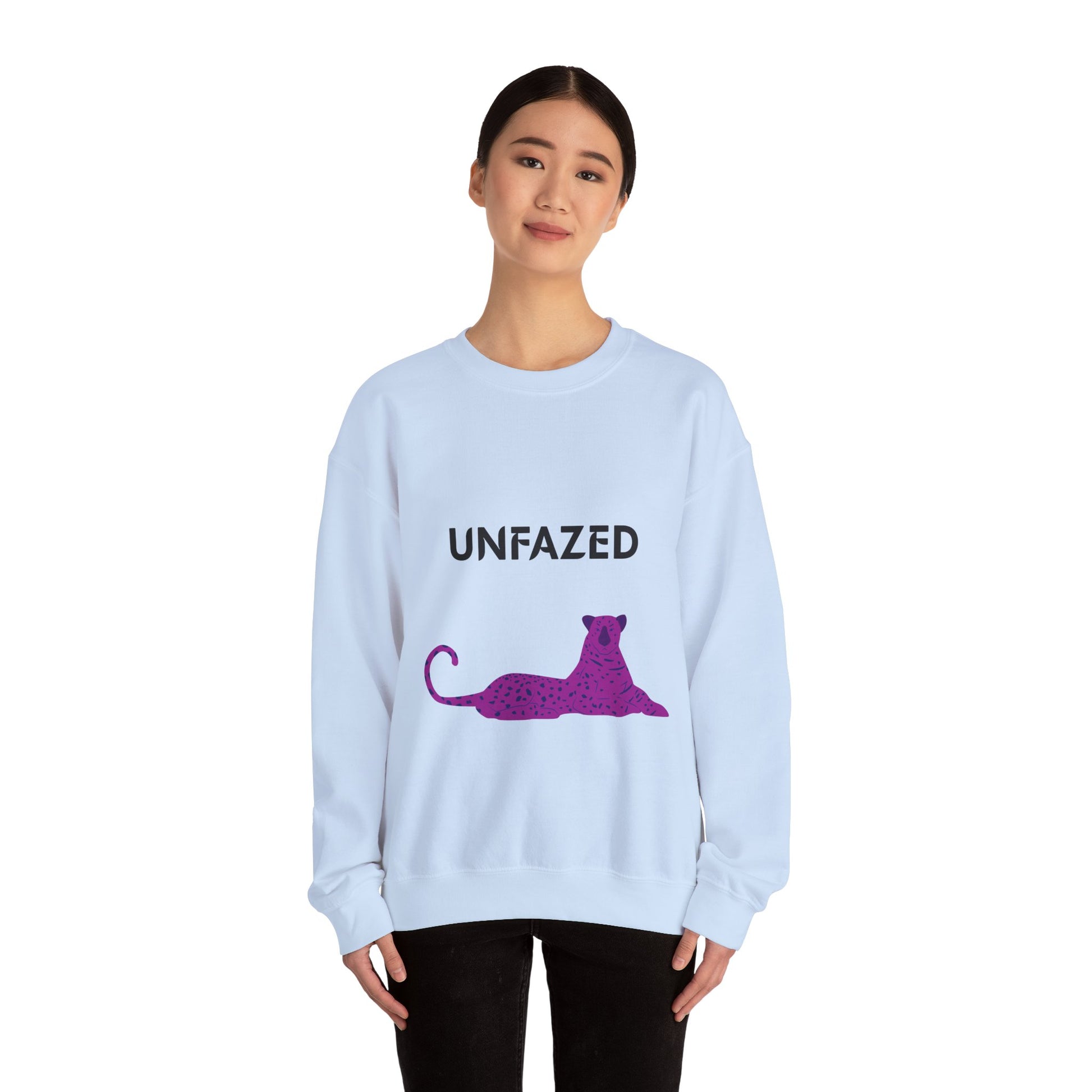 This cozy crewneck sweatshirt feels like a quiet exhale on a busy day. A relaxed, classic silhouette carries a bold, playful graphic: a reclining purple cheetah beneath the confident word “UNFAZED.” It reads like a personal mantra — calm, composed, a little mischievous — and sits cleanly on a soft white ground so the art pops. Built to last and soften with wear, it’s the kind of layer you reach for when you want comfort without sacrificing personality. Wear it while sketching at a café, grabbing drinks with friends, or padding around home on slow Sundays; it holds up to daily life and keeps its shape wash after wash.